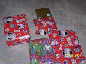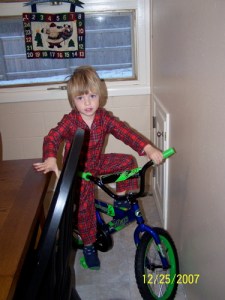 Pics: Kids and my sister, Dailah and her favorite thing of all time–babies, our family pic we’re sending to Tariku, my side of the fam’s pic, Dailah in her Christmas dress from my sister, the kids and their Christmas PJs, Trysten and his new bike, Tariku’s presents from Santa and us.