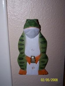 Third picture: A hilarious light switch cover my mom had bought and didn’t notice that the frog is cupping his “manhood”.
