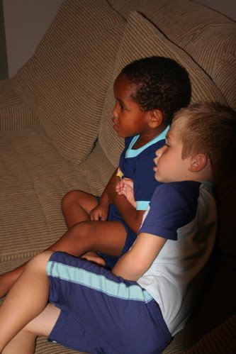 And tonight before bedtime we finished the movie, Nemo. Here are the boys (who were slightly scared of Bruce the shark). Seriously, this is so cute I want to cry, and might, since my allergies are so bad.
