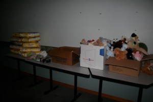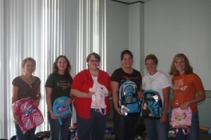 250 backpacks full, each one has: pajamas, toothbrushes, undies/6 diapers, snacks, stuffed animal/blankets. Each backpack had an age (example 5t girl) and would get a bag with what a 5t girl would need.