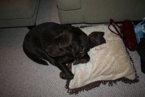 After opening and the aforementioned superb meal, it was time to get home in time to make Santa some cookies and read “Twas the Night Before Christmas.” It was a long, early so everyone in the car did this except for Zach (and only because he was driving). Doozie hoarding her new loot.