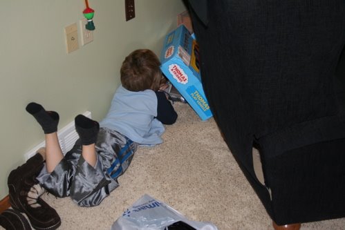 Trysten received some new games for his Leapster. Just in case a brother or sister roamed by unannounced and asked Trysten if he’d share his game, Trysten chose to hide in a corner and get some good game time.