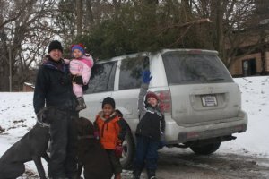 But we made it! Lips were blue, cheeks were red but the car was warm(er). Zach threw the tree on the car and we were off the 300 meters to the house. The tree rolled off once but Zach just threw it back on top and we were good to go. Look how happy they all were!