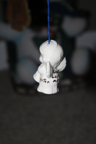 My grandma makes ornaments for us every year. If not for her, we’d have NOTHING and I personally LOVE getting them out every year to see our names on them. They are my true favorites. Here is one of my faves, a little angel.