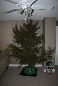 After which we ate some not-so-local food (unless the Kraft Mac and Cheese is made here, which I would be thrilled about). After bellies were full and no more threats were being made of frostbite, we tackled the decorating of the tree. Zach and I had a personal laugh about the look of the tree. It’s very rugged, lots of personality. Trysten named it “mohawk” and I think that’s perfect. This is what I saw when Zach told me to come upstairs to see it.