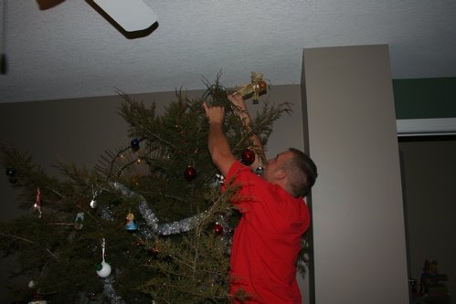 Then it was time for Zach to put the angel on top of the tree. Since the tree was so big, it actually bent at the top. So the angel is instead on the 2nd tier (ish). Good laughs again.