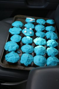 Trysten asked for my famous made-from-scratch cupcakes with blue frosting. This was them on the way to his school’s party.