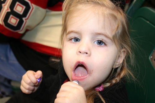 Within 2 minutes the first fight broke out. Everyone was on their feet yet I insisted the boys stay seated so as to show our support of making love not war. I had truly forgotten that hockey players and fans have turned violence into an art form. Within 3 minutes Dailah had decided she was bored and did 1 of these 3 things at different points in the night.