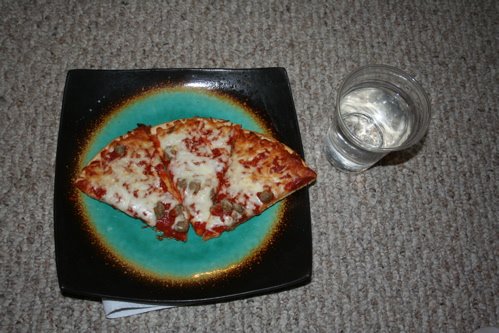 1:00 pm I get around to eating. On the menu today is 3 pieces of Tombstone pizza and multiple glasses of water.