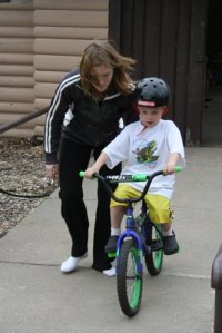 3:00 pm attempt to teach eldest to ride the bike without training wheels. Notice how much he is like his mother in that he gets frustrated when he notices it will take more than 2 minutes to get hang of this. Promptly asks if he can be done yet. 3:10 pm mother makes mental note to teach child more patience.