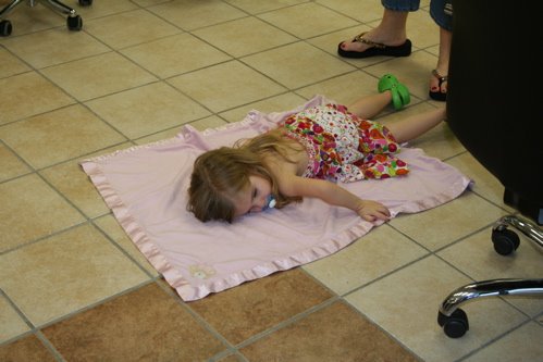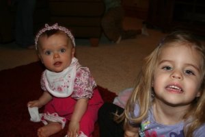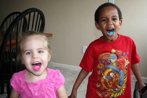 9:00 am the kids get their first shot of sugar in gum leftover from their Easter candy. Fittingly, pink for her and blue for him.