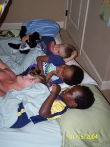 After a delicious dinner and great conversation with the hosts, we were off to Matt, Amanda and Teshome (and soon Samrawit!) where we were to stay for the weekend. Tariku was definitely most excited to see Teshome as they were great friends in the care center (though Tariku again expressed that by slapping). We got there a little late so we let them play and then they somehow talked us into letting all 3 boys sleep together. Amanda was nice enough to read a book to them in their air mattress bed.