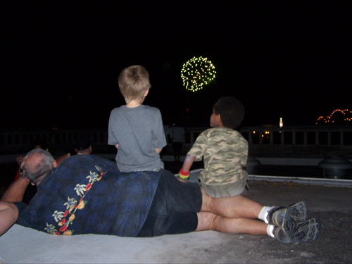 Upon completion of his entire grilled cheese Tariku pointed to the empty plate and said, “That makes me very sleepy”. (Note: it was already 1 hour past bedtime at this point). So his idea was to go up to the Y, take a nap and then have me wake him when the fireworks started. Didn’t turn out that way but this was his A+ effort.