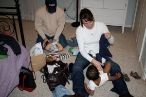 I snapped this pic just before I was leaving. Tiffany and Dave changing their two youngest. Though most of our lives are spent wishing for stages like these to go far, far away, I’m guessing the two of them will mourn the loss when the boys refuse to hold hands anymore.