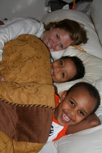 During the day we had a knock on the door and an Ethiopian was there asking for Tomas. He said that Tomas needed to go next door to the care center to the administration. We were a little worried and confused so I sent Zach (having just gotten out of the shower). When Bini and I joined them a few minutes later Zach explained that he walked in to 4 nannies and the head nurse almost in tears missing Tomas. The head guy hadn’t seen Tomas yesterday and missed him, he needed to see Tomas. 🙂 So Tomas was given sunglasses and lots of hugs and kisses and sent on his way. I can’t tell you how good it feels to know for the last year and a half they have been so loved, so well cared for. God is good for sure, especially in this case.