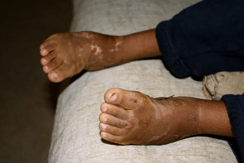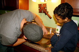 Taking the strips off and scrubbing (gently) the layers of dead skin off his tiny little legs.