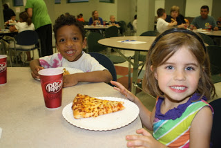Get to the school. They are selling pizza and pop. We buy lots of that. These two think it’s the best.